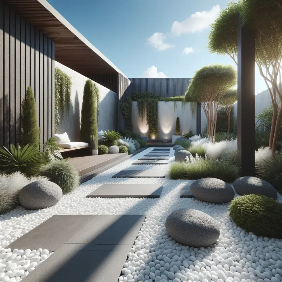 Minimalistyczne aranżacje – połączenie białych otoczaków z korą antracytową